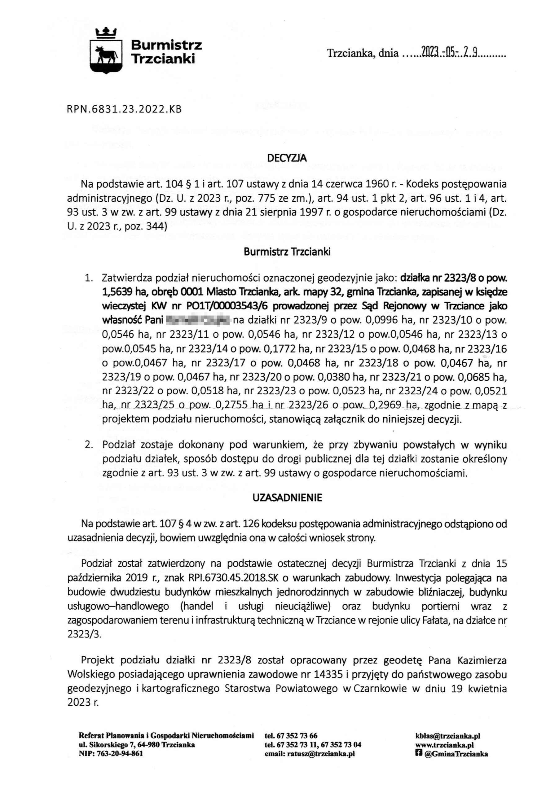 Decyzja Burmistrza Trzcianki z dnia 29.05.2023r.